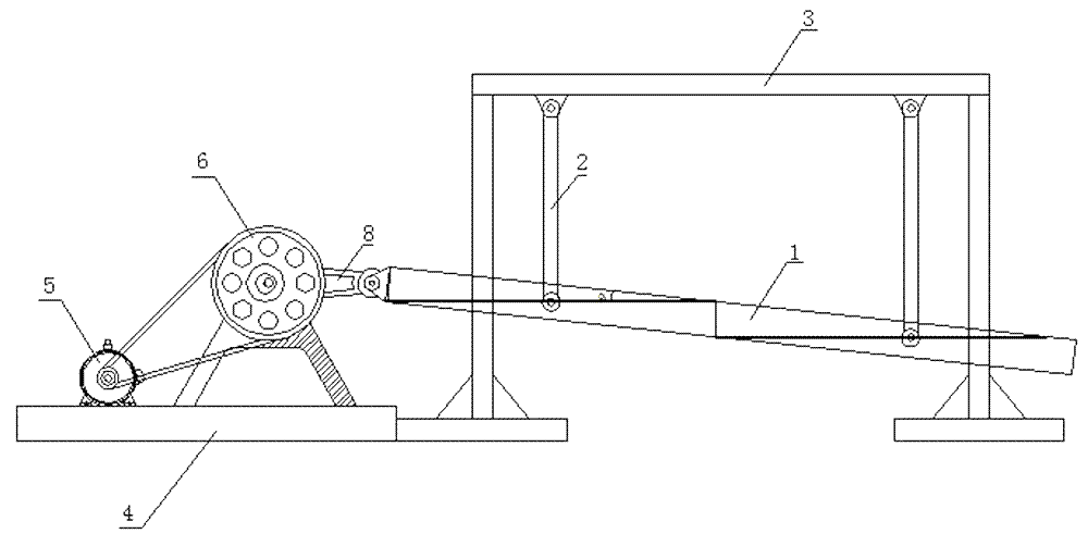 1、網(wǎng)架 2、懸吊裝置 3、支撐梁 4、傳動底托 5、傳動電機(jī) 6、 偏心往復(fù)裝置 8往復(fù)臂