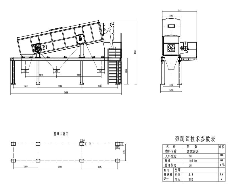 運(yùn)行垃圾分選彈跳篩前檢查:包括設(shè)備衛(wèi)生,各部位連接螺栓齊全、緊固、完好,檢查激振器是否完好,檢查各彈簧 有無(wú)損壞、缺少、斷裂等現(xiàn)象,檢查三角帶是否張緊有無(wú)斷裂篩箱、篩板有無(wú)損壞,檢查篩板有無(wú)雜物堵塞篩面要平整無(wú)損壞、松動(dòng)現(xiàn)象,檢查進(jìn)出料溜槽是否暢通檢查橫梁有無(wú)開(kāi)焊等現(xiàn)象,檢查安全防護(hù)裝置是否安全可靠,檢查控制箱、通訊、照明是否完好,接地保護(hù)是否可靠,控制按鈕是否靈活可靠。啟動(dòng)時(shí):開(kāi)啟垃圾分選彈跳篩后,站在控制箱旁監(jiān)視設(shè)備起動(dòng)發(fā)現(xiàn)異常立即停機(jī)。啟動(dòng)正常后再次巡查每臺(tái)垃圾分選彈跳篩的噴嘴有無(wú)堵塞或脫落,經(jīng)常觀察電動(dòng)機(jī)的溫度和聲音,經(jīng)常觀察激振器的聲音,觀察篩子的振動(dòng)情況四角振幅是否一致有無(wú)漏煤現(xiàn)象三角帶是否松動(dòng)或脫落,經(jīng)常觀察脫水脫介效果。檢查篩子入出料情況是否正常有無(wú)堵塞。