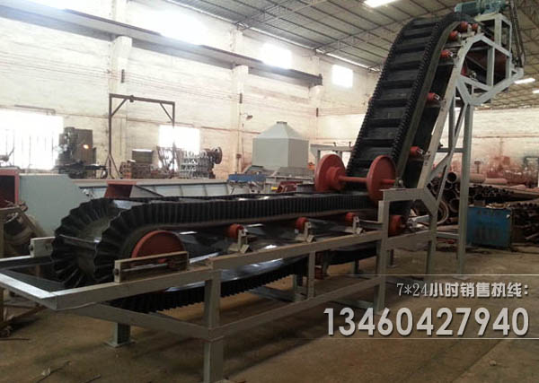 a)大傾角擋邊皮帶輸送機工作原理就是在平面的輸送上面分成一格一格的,在皮帶中間焊有一條條的擋板,在皮帶的兩邊焊的波狀擋邊形成一體,用來輸送散料;