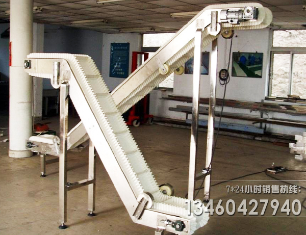 b)擋邊皮帶輸送機用于斜坡輸送,可以把低處產(chǎn)品提升到一定的高度,用于物料提升,在提升的過程中,可以將散料放在一格一格里面,在傾斜的角度中,不會滑;